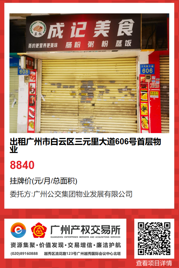 現(xiàn)有廣州市白云區(qū)三元里大道606號首層物業(yè)出租項目,該項目在廣州公有物業(yè)出租平臺網(wǎng)站自掛牌公開招租,歡迎有意向的企業(yè)法人或自然人(含個體工商戶)參加應(yīng)租。現(xiàn)將有關(guān)事項說明如下: